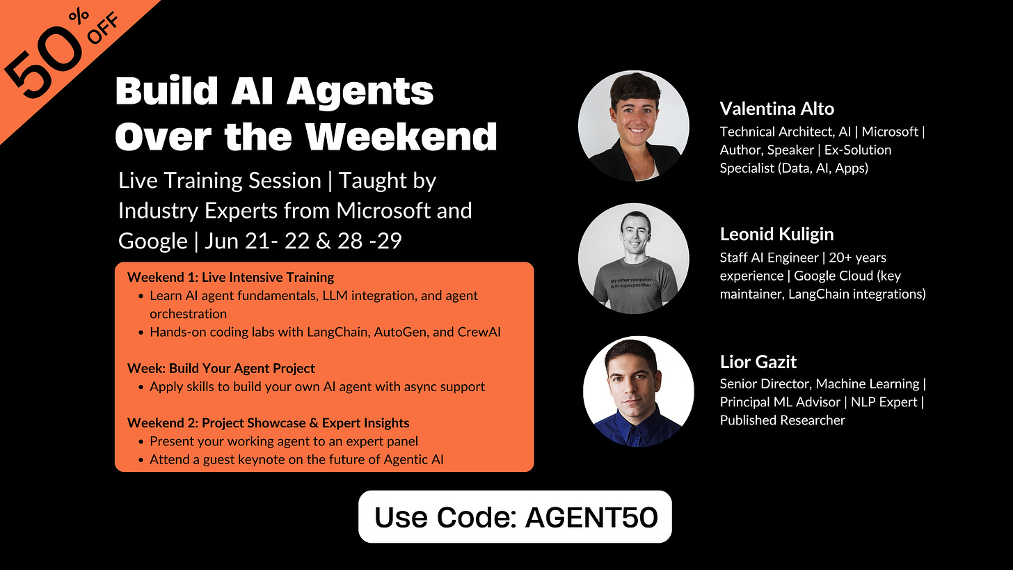 Join Packt’s Accelerated Agentic AI Bootcamp this June and learn to design, build, and deploy autonomous AI Agents using LangChain, AutoGen, and CrewAI. Hands-on training, expert guidance, and a portfolio-worthy project—delivered live, fast, and with purpose.